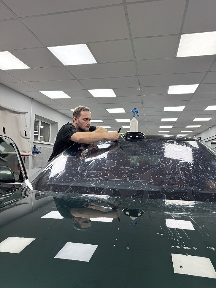 Если плёнка наклеена с пузырями, заломами или искажает обзор, её можно аккуратно снять и заменить. Стекло очищается от остатков клея, после чего выполняется новая оклейка с соблюдением технологии и оптических требований.